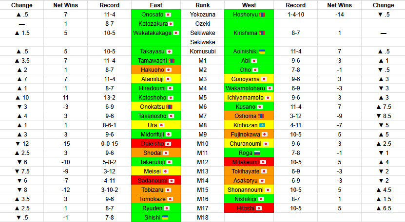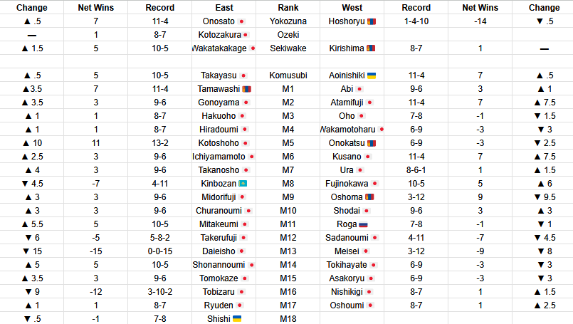 And if you scroll down you’ll see the new banzuke and how close it was to my prediction. Spoiler: I was right about both Aonishiki and Shishi.
