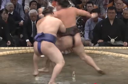 That feels a little unfair. The dead body rule was in effect here with the referee (and seemingly the judges) believing Hoshoryu was an inert object in the air while Hakuoho was launching him off the ring. That gives no credit to Hoshoryu’s uwatenage attempt or his attempted slap down in mid-air.
