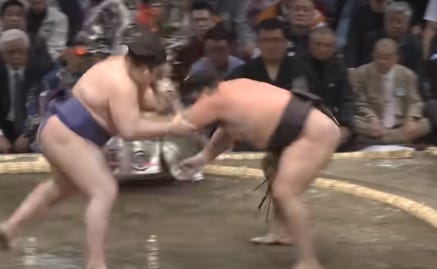 At least things have been consistent, though (at least when applied to Hoshoryu). This loss is very reminiscent of Hoshoryu’s loss to Onosato, where he was declared a “dead body” despite working for a slap down in mid-air. Hoshoryu needs to take the hint now and know that the shimpan (judges) aren’t going to view those mid-air attempts as worthy of a torinaoshi (rematch).