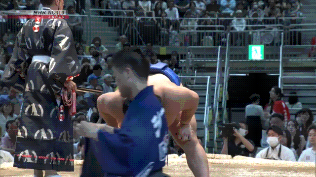 This was a strange bout for Abi. He showed a lot of respect fo Aonishiki’s game, by not attacking full throttle off the tachiai (or trying to hit him with a henka). This resulted in them locking up in almost a freestyle wrestling set-up. It also meant Abi was forced to stand still and he hates that. Aonishiki went for a slap down, but the lanky Abi resisted that. Abi then missed a slap down attempt of his own. Abi landed in the danger zone when he missed and Aonishiki then collapsed on him for the force out.