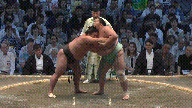 Oho did well to stand up to Onosato’s pressure off the tachiai and push him back with thrusts, but the bout ended because Onosato accidentally stepped out of bounds. The first thing every sumo wrestler learns is to keep your feet low to the ground, skimming instead of stepping to avoid this happening.