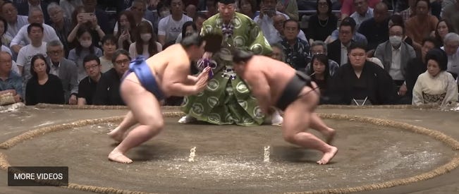 When these two faced each other in the last tournament, Onosato nailed Hakuoho with a picture-perfect hatakikomi (slap down). His deployment of the slap down in that tournament was, in my opinion, a key component to his success. He showed a lot of commitment to that move and triggered it early to give himself lots of time and space to pull it off.