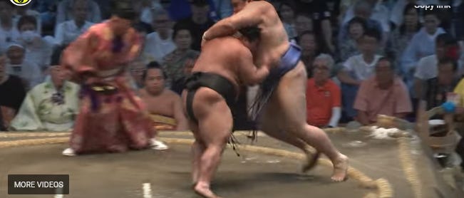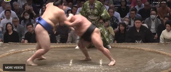 Recognizing what your opponent did the last time and deciding how to confront them the next time is sumo’s chess game. After being slapped down Hakuoho had to decide whether to plow forwards in this match, risking the same fate, or charge in with more caution and potentially risk getting run over by Onosato (if he decides to plow forwards himself).