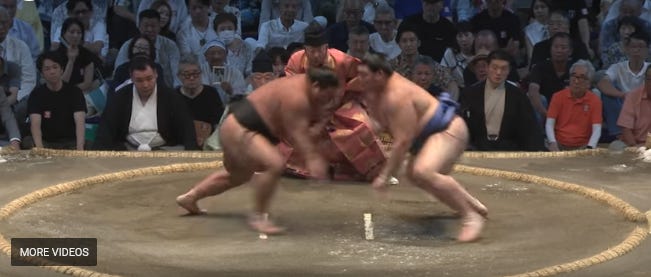 I think the effectiveness of Onosato’s hatakikomi is a good barometer for how composed and focused Onosato is in a given tournament. In May he was locked in and he committed to this move early against Hakuoho, Takeurufji, Daieisho and Ura and got wins over them all. In this tournament this is the second example of Onosato not being completely focused (the first was his accidental step out against Oho).