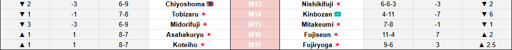 The general rule is that wrestlers move up and down based on their net wins or losses from the past basho. That means that a wrestler who went 8-7 has a net score of +1. That then means they are probably going to move up one space. However, we can’t assume that’s the case for everyone. Context matters. And, also, sometimes you just have to stick guys somewhere that more or less makes sense.