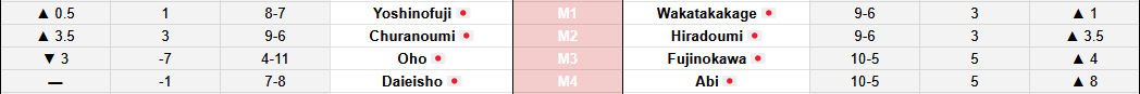 I have Churanoumi going up to a career best M2e. That is a mildly generous promotion (3.5 ranks off three net wins). Hiradoumi gets the same degree of promotion to also claim M2w.