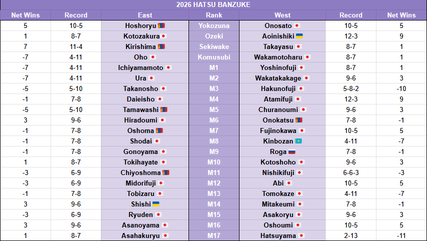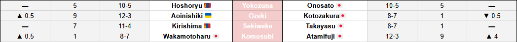 Hōshōryū and Ōnosato stay put. They tied on records, so Hōshōryū holds onto the number one spot (the east).