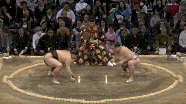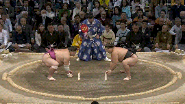 Kotonowaka’s intelligence is on full display in this bout, too. He quickly isolates Daieisho’s right shoulder for the swing down. This makes me think he had this move planned from the get-go and that it’s a product of scouting Daieisho (someone he’s done well with in the past and has already beaten by hikiotoshi and hatakikomi).