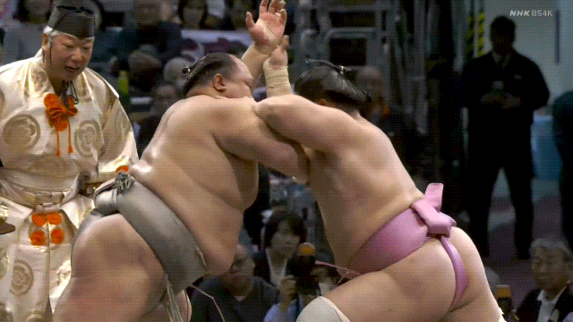 The fact Daieisho wasn’t able to move Kotonowaka off the tachiai says a lot. Kotonowaka has an impressive ‘armour of fat’, but he’s also got a lot of muscle hiding underneath. He’s able to stop Daieisho here without bending his knees, meaning a lot of the strength he’s using to stop one of the most forceful pushers in the game is coming from just his back and shoulders.